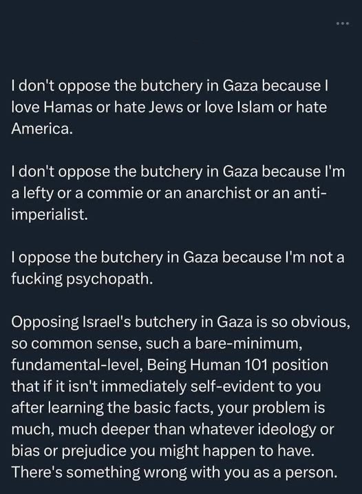 HonoraryMancunian@lemmy.world to Microblog Memes@lemmy.worldEnglish · edit-26 months agoOpposition to the butchery in Gazalockimagemessage-square160linkfedilinkarrow-up11.75Karrow-down141